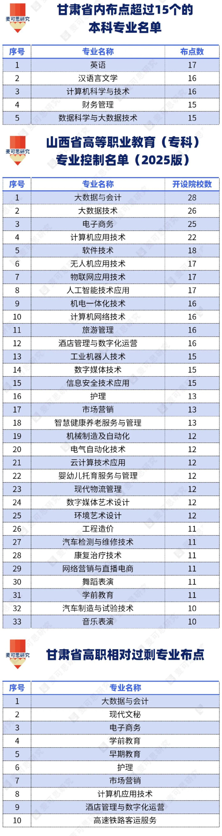 进入2025年,山西省、甘肃省还更新发布了高职供给过剩专业名单。