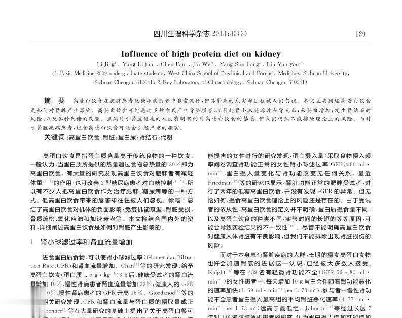 参考文献[1]李婧,杨丽君,陈帆,等.浅述高蛋白饮食对肾脏产生的影响[J].四川生理科学杂志,2013,35(03):128-132.